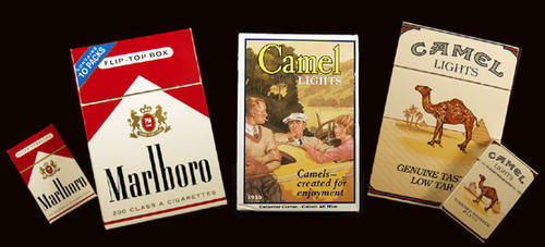 Marlboro / Camel Jumbo Packs. Each large pack holds 10 regular packs of cigarettes. Available in US duty-free stores. Camel Jumbo Packs come in 9 different designs for collectors. These were purchased at Newark airport in NJ in mid-July 2002. Featured in this display, Marlboro "Red" and Camel Lights.