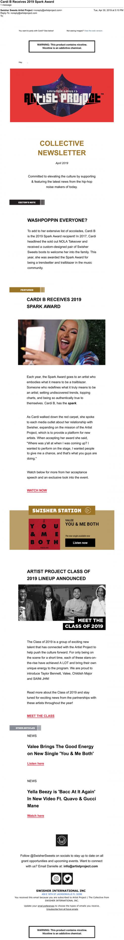 Email from the Swisher Sweets Artist Project in April 2019, featuring popular singer and brand spokeswoman Cardi B, with a link to watch her acceptance speech at an awards show with a behind-the-scenes look. Also includes links to listen to music, meet the newest lineup of Artist Project rappers, and other music news and videos.