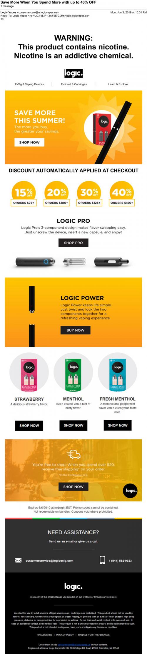 Email from Logic in June 2019 promoting a summer sale on the brand website. Highlights the Pro and Power devices, showing some flavors that are available.