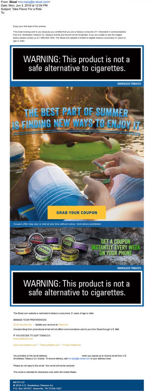 Email from Skoal in June 2019 with a summer theme, and a link to claim coupons from the brand website, with a reminder to claim instant mobile coupons. Includes images of several available flavors.