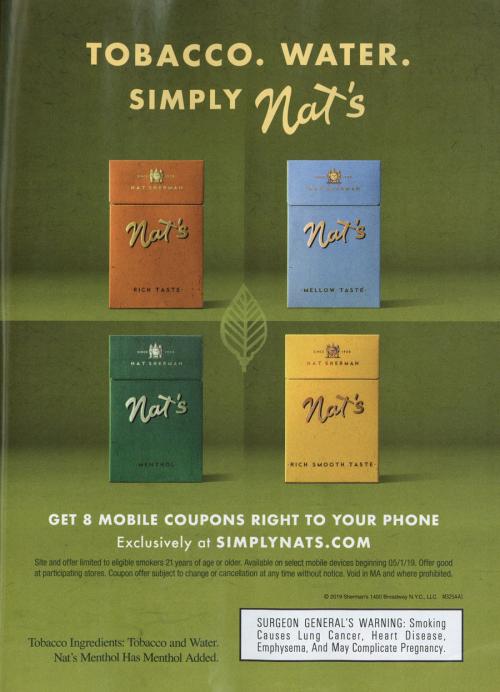 Nat Sherman ad with the copy "Tobacco. Water. Simply Nat's." Has images of their different styles, including menthol. Includes an offer to claim mobile coupons via the brand website.