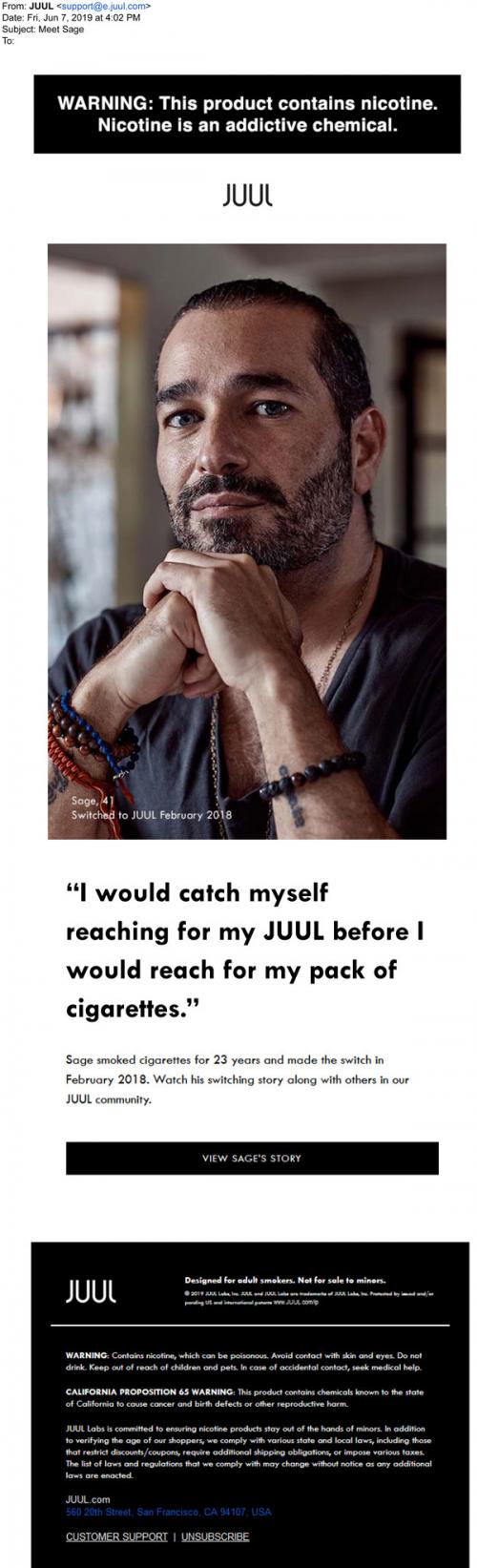 Email from JUUL in June 2019 with a quote from a customer testimonial and a link to the brand website to learn more about his "switching" story, and others in the Community of JUUL users.