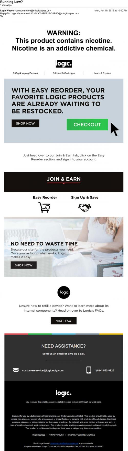 Email from Logic in June 2019 promoting their Easy Reorder system, with a link to the brand website to shop. Also provides a link to the FAQs to learn more about the brand's products.