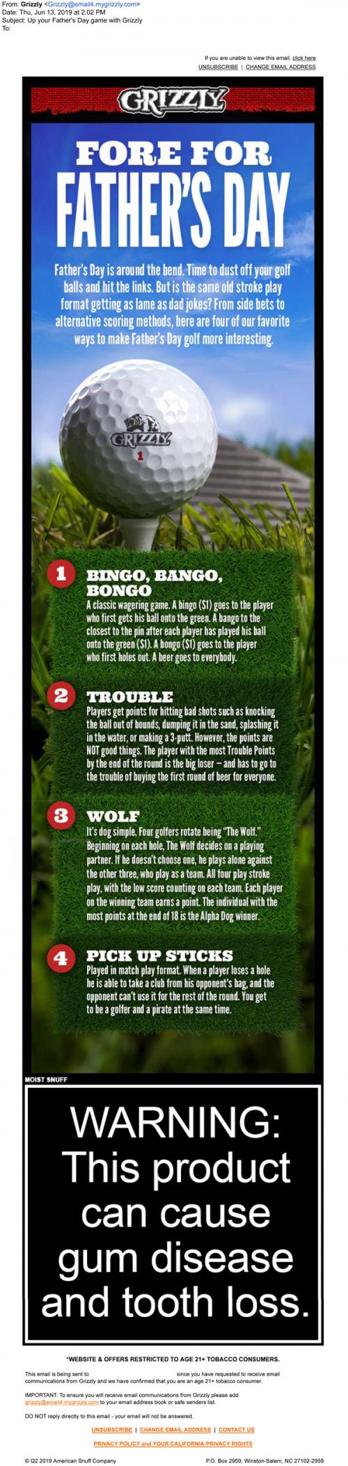 Email from Grizzly in June 2019 with a list of golf games to play for Father's Day.