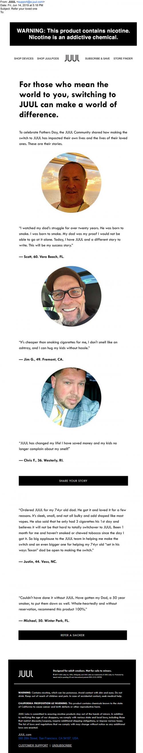 Email from JUUL in June 2019 celebrating Father's Day with stories from dads about switching to their product. Also solicits for more stories and links to the smoker referral program.
