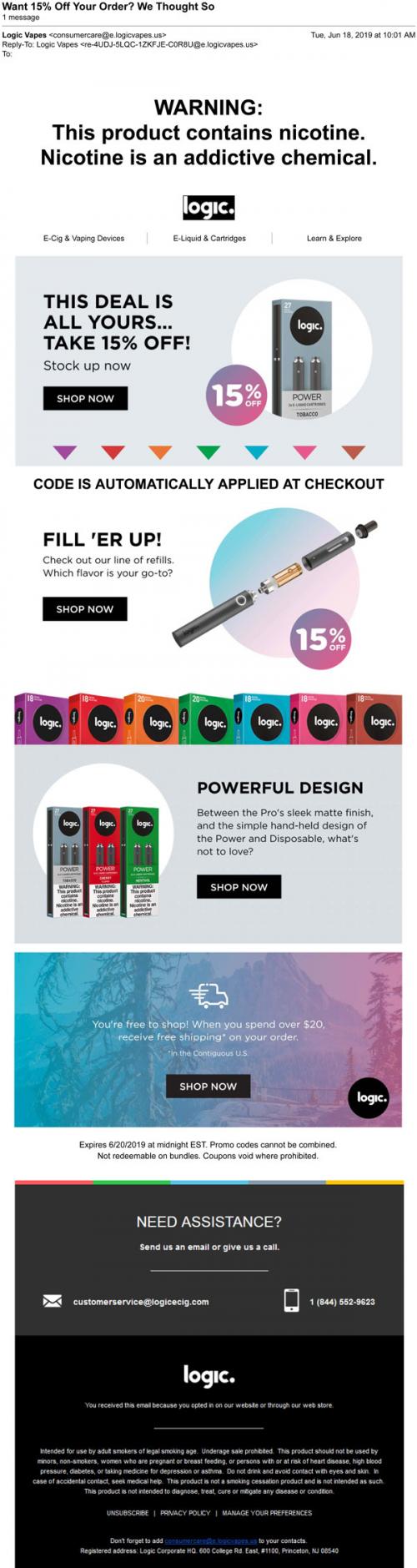 Email from Logic in June 2019 promoting a sale on the brand website, with a focus on their flavor selection.