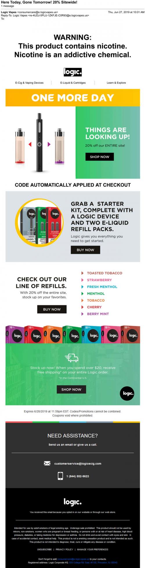 Email from Logic in June 2019 that promotes a sitewide sale on the brand website, with a focus on their flavor selection.
