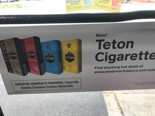 Door sign promoting new Teton cigarettes, advertised on the pack as created with "Tobacco, Water, Sun."