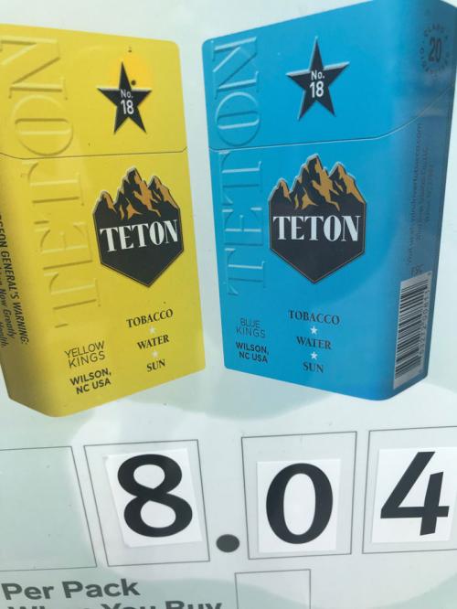 Outdoor sign promoting new Teton cigarettes, advertised on the pack as created with "Tobacco, Water, Sun."