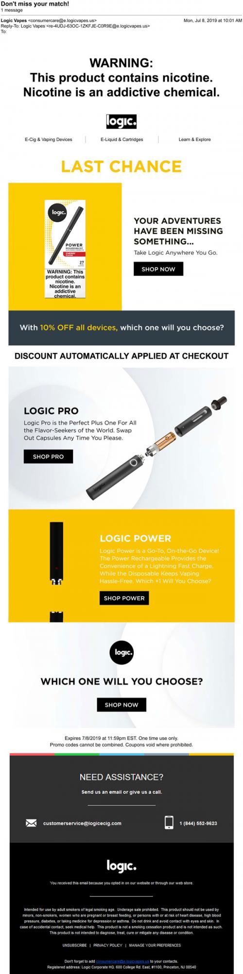 Email from Logic in July 2019 promoting a sale on devices through their brand website, like the Pro or Power.