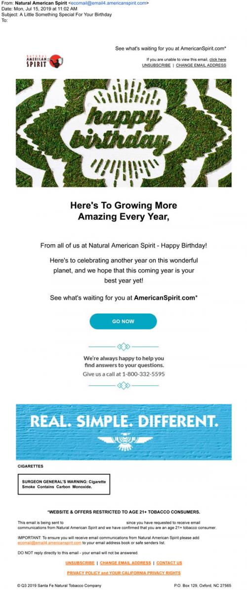 American Spirit email in July 2019 sending a happy birthday wish to the recipient, inviting them to see a video on the brand website.