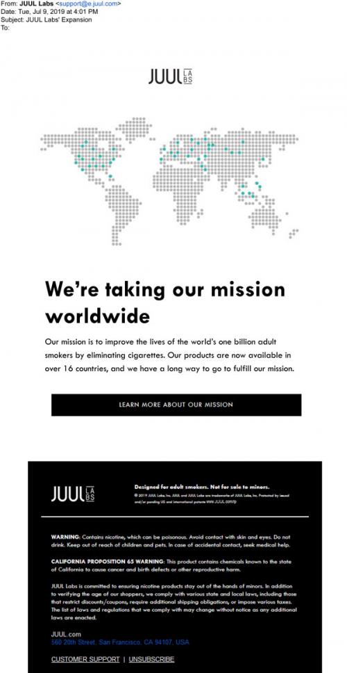 Email from JUUL in July 2019 with a link to their brand website to read about their mission and how the brand is expanding worldwide.