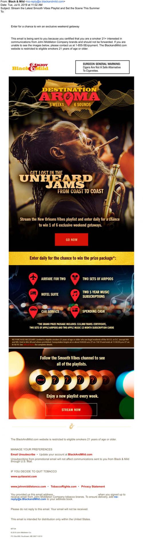 Email from Black & Mild in July 2019 promoting the Destination Aroma sweepstakes. The recipient is invited to the brand website to listen to the themed music playlist and enter for a chance to win.