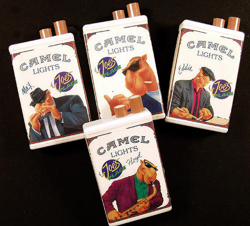 Camel lights: mock packs as lighters. "The Hard Pack" labels: Joe's Place: Joe, Eddie, Floyd, Max. Joe Camel