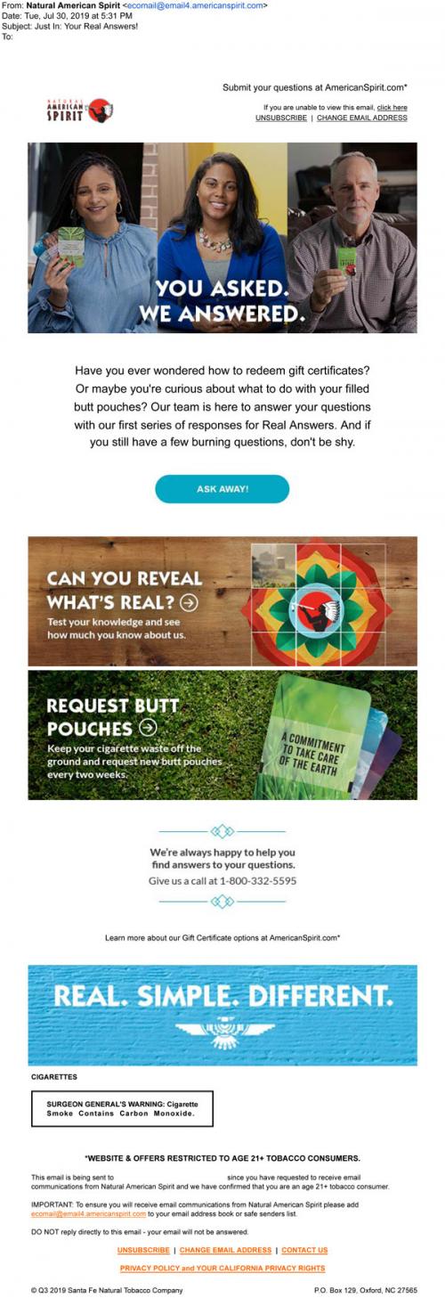 Email from American Spirit in July 2019 promoting their Real Answers FAQ on the brand website, as well as a brand knowledge quiz and the chance to claim coupons and butt pouches.