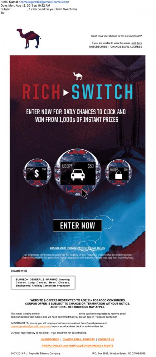 Email from Camel in August 2019 promoting the Rich Switch sweepstakes, with a link to the brand website to enter.