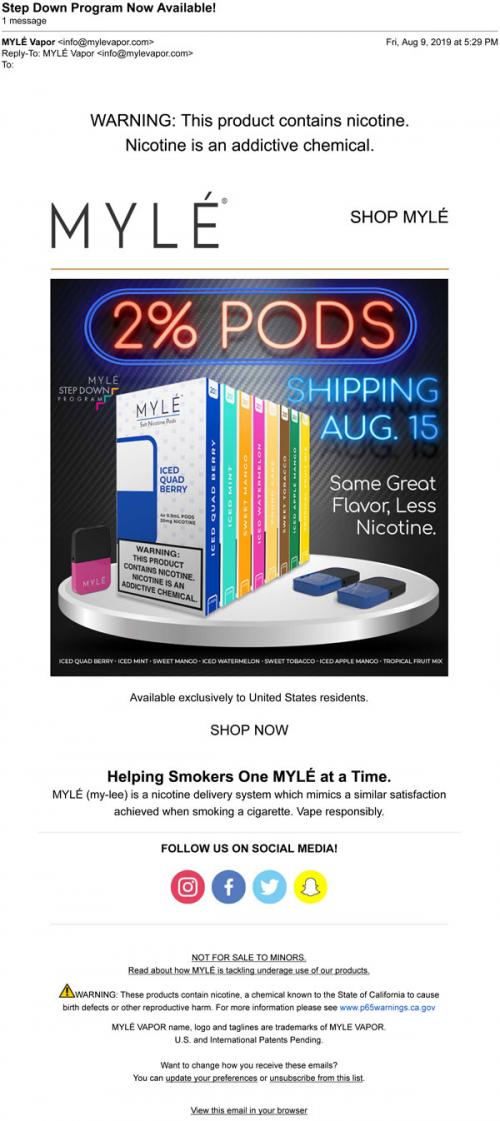 Email from MYLE in August 2019 announcing their "step down program," which means that lower nicotine cartridges are now available to US customers (2% nicotine).