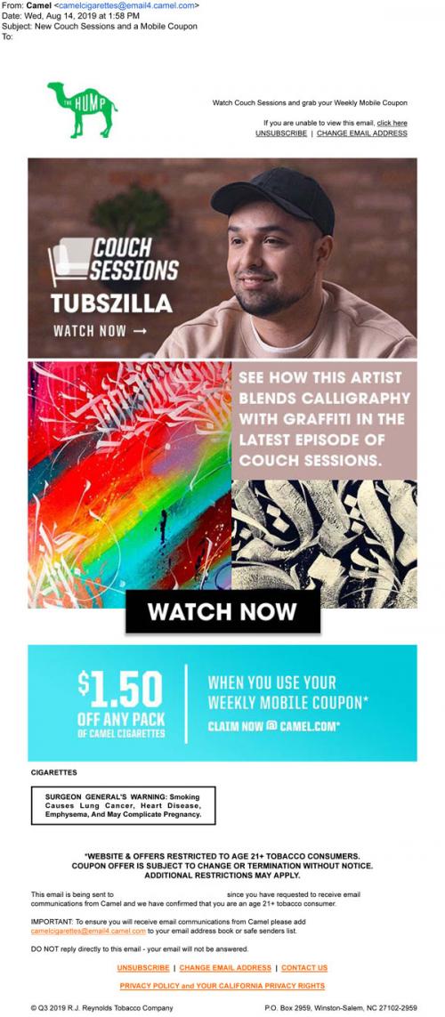 Email from Camel in August 2019 promoting a new episode of Couch Sessions on the Hump, featuring a new artist. Also provides a link to claim weekly mobile coupons on the brand website.