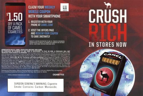 Direct mail received from Camel in August 2019 that promotes the Crush Rich product now available in stores, as well as the Rich Switch sweepstakes. Describes the various Crush products, includes coupons, and reminds the recipient to claim weekly mobile coupons.