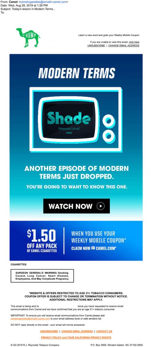 Email from Camel in August 2019 promoting the newest episode of Modern Terms on the Hump, including a reminder to claim a weekly mobile coupon.