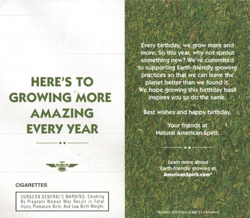 Direct mail received from American Spirit in August 2019 for the recipient's birthday. Includes a card that encourages being earth-friendly and a packet of basil seeds in a white box with a grass mandala and the brand's logo on the back.