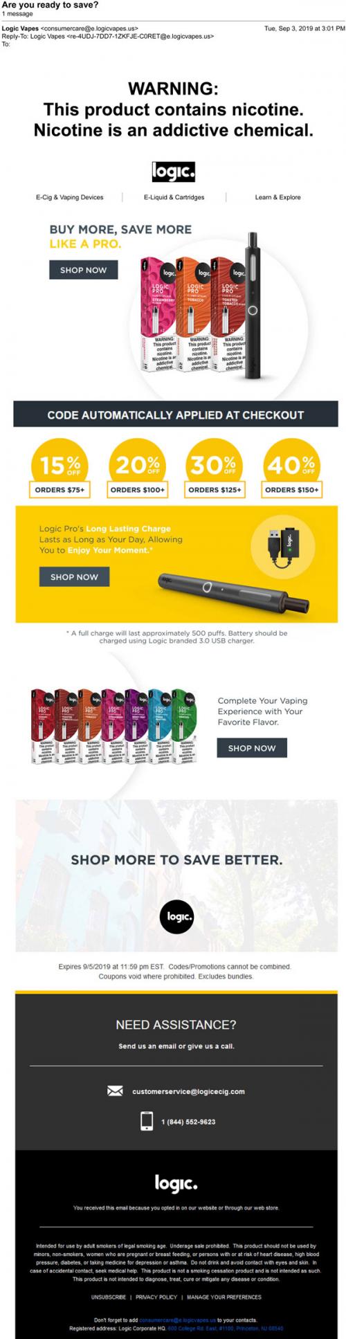 Email from Logic in September 2019 promoting a sale on products through the brand website, with a focus on their Pro device.