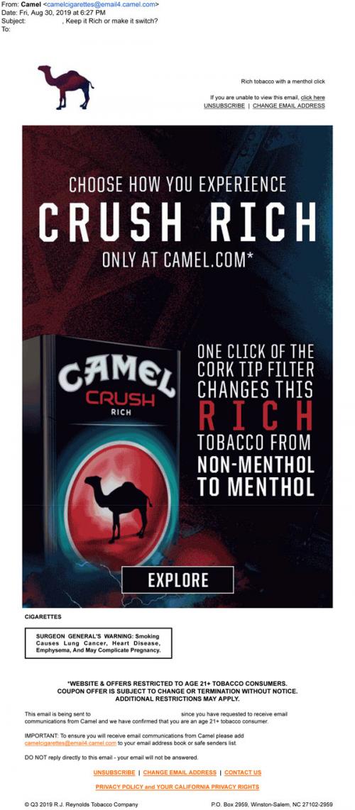 Email from Camel in August 2019 promoting their Crush Rich product, with a link to the brand website to learn more.