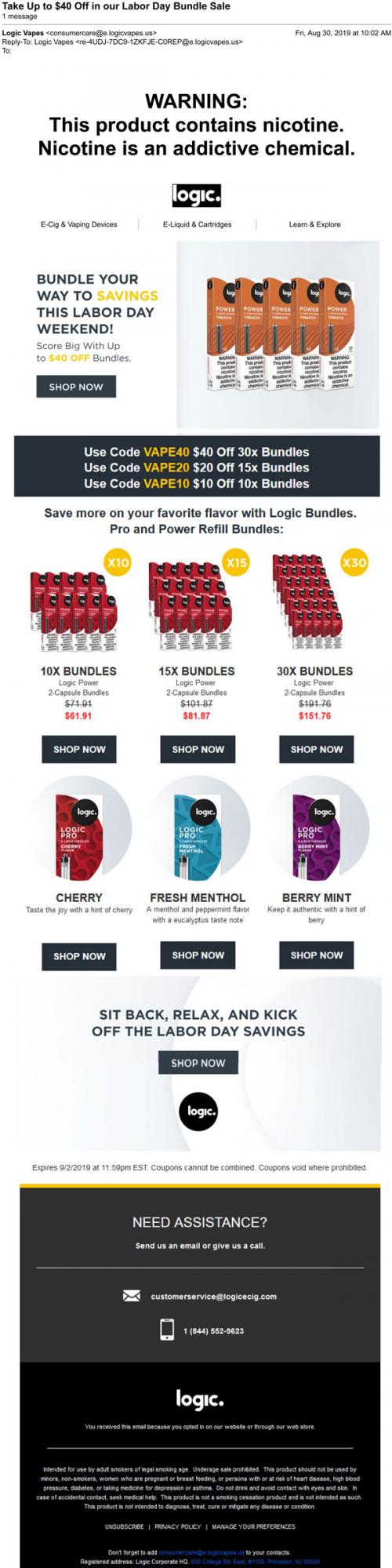 Email from Logic in August 2019 promoting a sale on bundles through the brand website, highlighting the various flavors they carry.