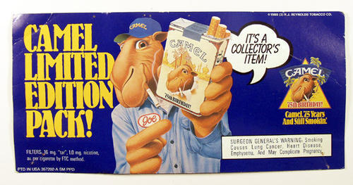 Small blue sign; "Camel Limited Edition Pack!" Joe Camel pointing to pack of Camel 75th birthday pack. "It's a collector's item." "Camel. 75 years and still smokin" and logo on right.