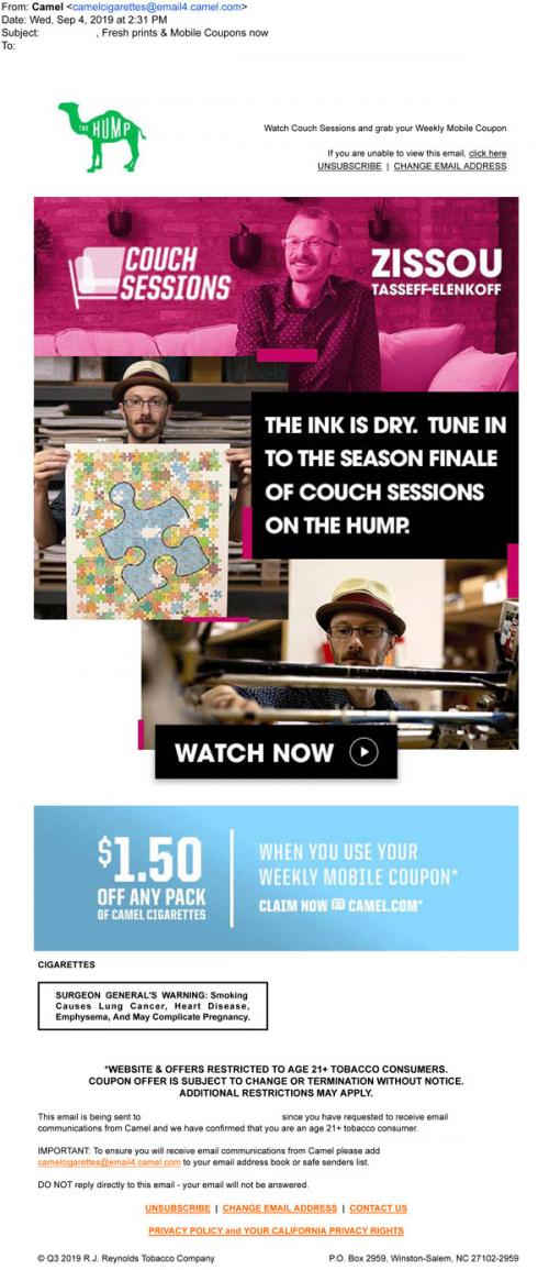 Email from Camel in September 2019 with an update from the Hump weekly feature, containing a link to a new episode of Couch Sessions and to claim a weekly mobile coupon.