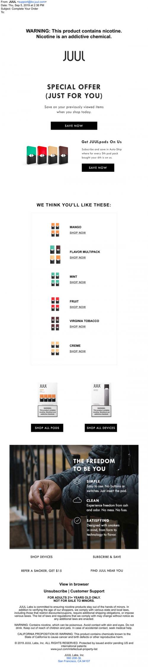 Email from JUUL in September 2019 promoting the auto-ship program to get free pod packs, with links to the online store to shop and check out all the flavors.