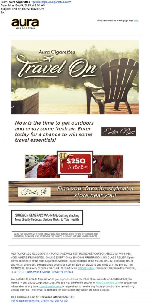 Email from Aura cigarettes in September 2019 promoting the Travel On sweepstakes, with a link to the brand website to enter. Also includes a link to use a store locator.