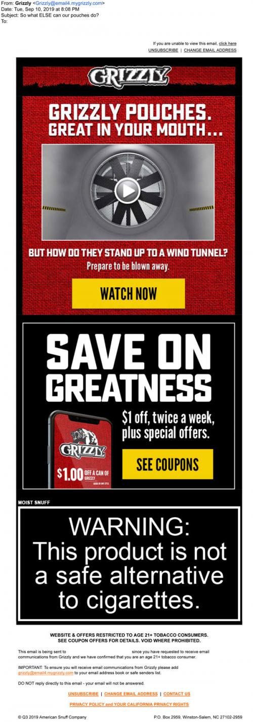 Email from Grizzly in September 2019 that links to a pouch "research" video and where to claim mobile coupons on the brand website.