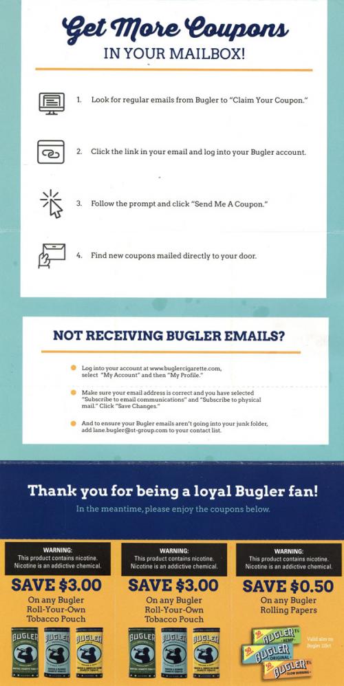 Direct mail from Bugler received in September 2019 that includes coupons. Encourages the recipient to claim more coupons with instructions on how to request them from the brand website, and how to ensure that you're getting emails from the brand. Promotes both their roll your own tobacco and rolling papers. Directs the recipient to the brand website to use a store locator.