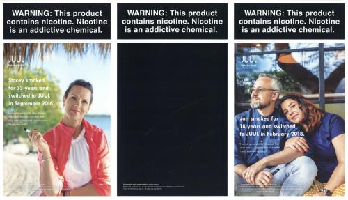 Direct mail from JUUL received in September 2019 that includes adult customer testimonials and portraits, as well as coupons. Emphasis is on smokers who have switched from using cigarettes.