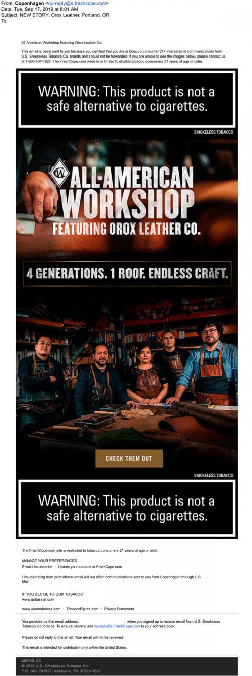 Copenhagen email received in September 2019 promoting the next feature on the All-American Workshop, focused on a family leather company.