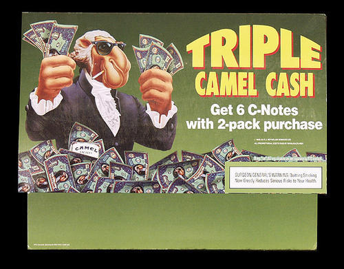 Green poster "Triple camel cash; get 6 C-Notes with 2-pack purchase" Image of Joe Camel as George Washington holdin camel cash.