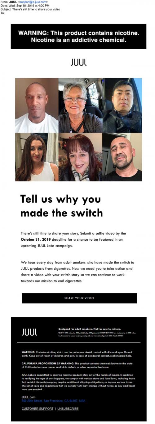 Email from JUUL in September 2019 encouraging the recipient to submit a selfie video to be part of the upcoming JUUL Labs campaign.