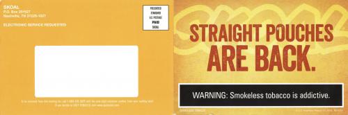 Direct mail from Skoal received in October 2019 promoting the return of straight tobacco pouches. Includes coupons.