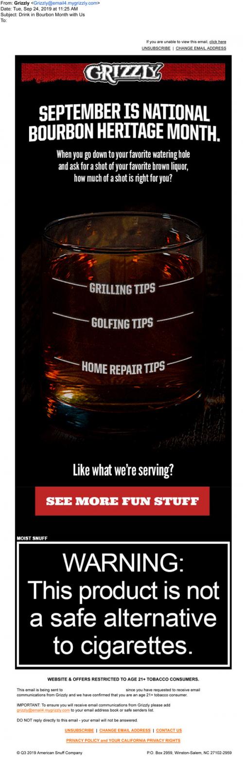 Email from Grizzly received in September 2019 celebrating National Bourbon Heritage Month with some "guidelines" on how much liquor it takes to have certain bar conversations.
