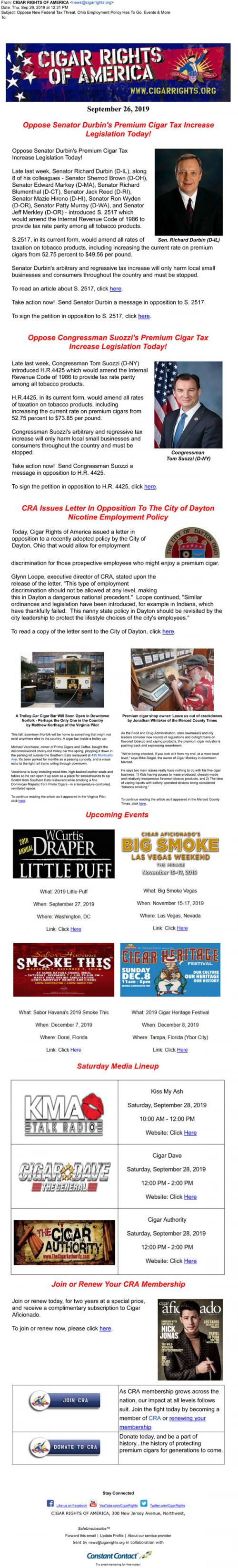 Email from the Cigar Rights of America in September 2019 updating the recipient about ongoing legislation and how to sign petitions and contact representatives. Includes some news articles and promotes upcoming events and media. Also solicits for donations and memberships.
