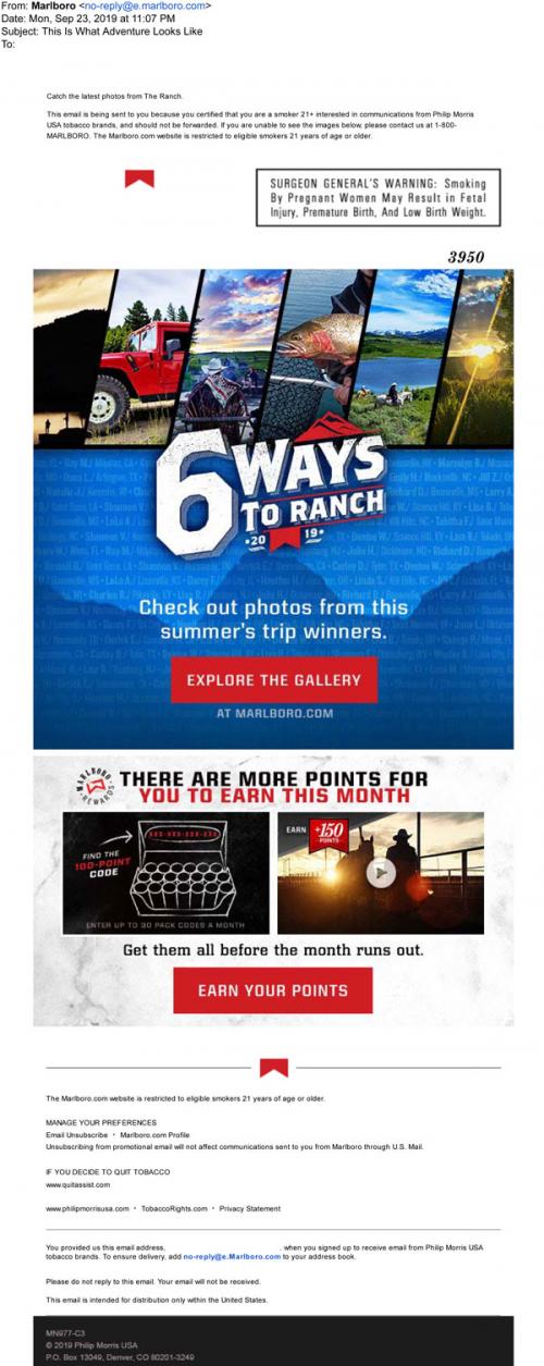 Marlboro email in September 2019 that provides links to see photos from the winners of the 6 Ways to Ranch Trip and learn how to earn more points in the Rewards program.