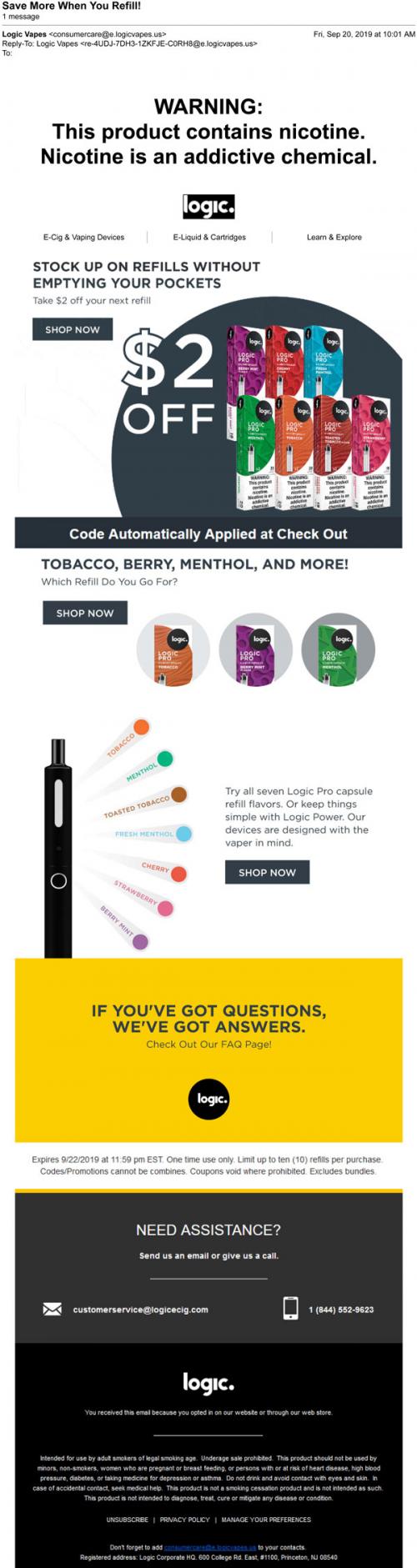 Email from Logic in September 2019 promoting a sale on various flavored cartridge refills.
