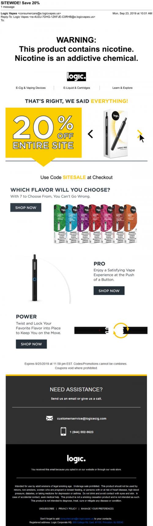 Email from Logic in September 2019 promoting a sale on refills and devices through the brand website.
