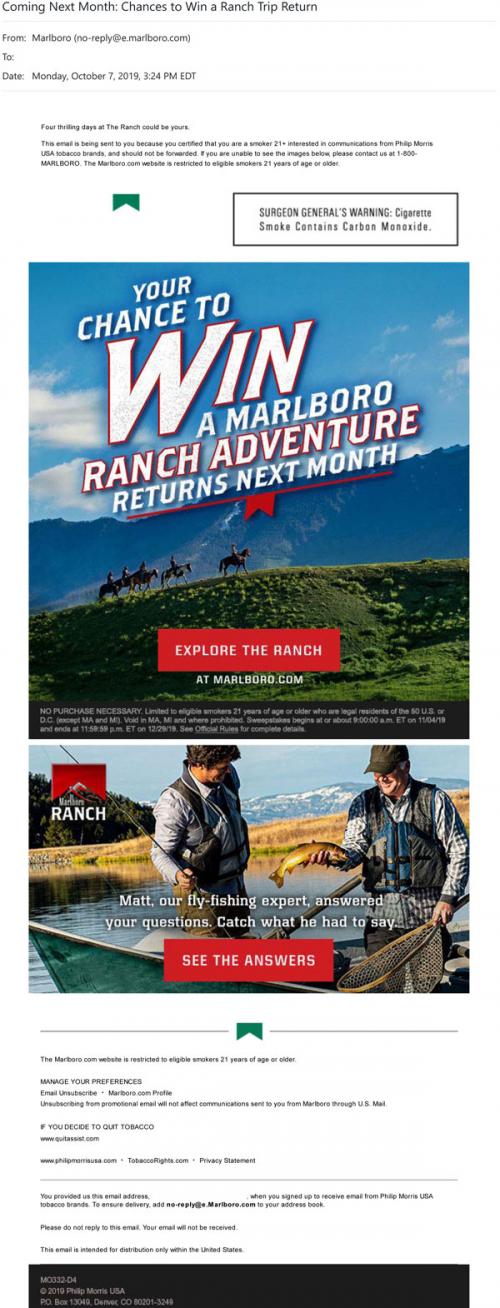 Email from Marlboro Menthol in October 2019 promoting an upcoming chance to win a trip to the Marlboro ranch. Also provides a link to see an expert answer questions about fly-fishing.
