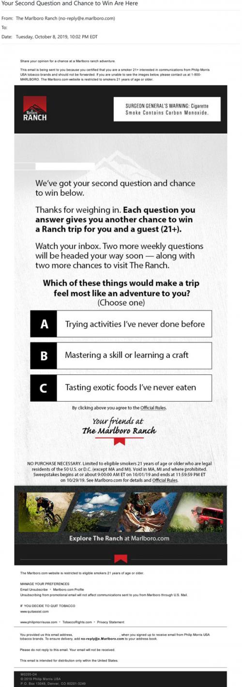 Marlboro email in October 2019 inviting the recipient to enter for a chance to win a trip to the Marlboro Ranch. Also provides a link to check out the Ranch on the brand website.