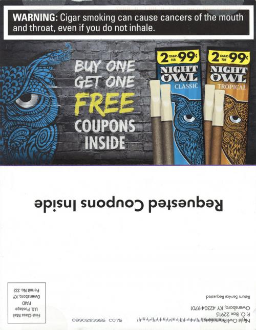 Direct mail received in October 2019 from Night Owl containing coupons. Invites the recipient to check out the brand website for more offers.