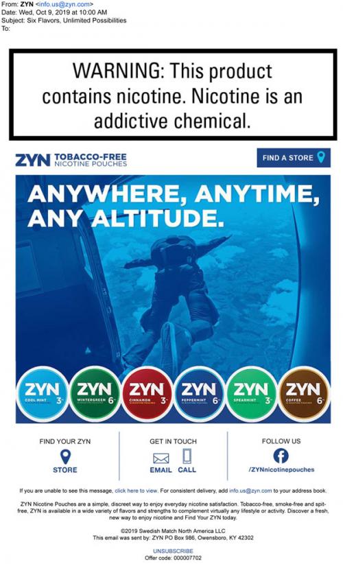 Email from ZYN in October 2019 that promotes their nicotine pouches in various flavors. Provides links to find stores or follow the brand on social media.