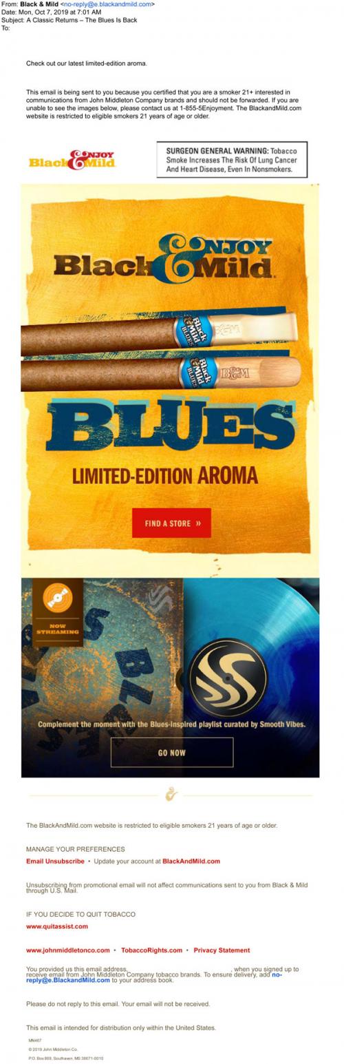 Email from Black & Mild in October 2019 that promotes the new Blues cigar, as well as new streaming music to listen to on the brand website.