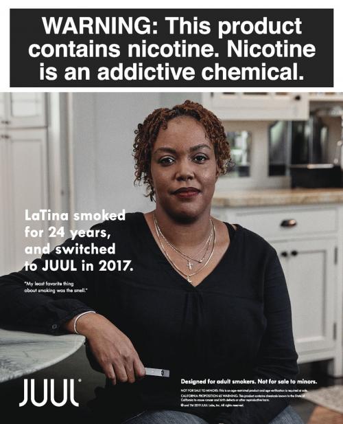 Magazine advertisement featuring a female ex-smoker who switched to JUUL.